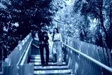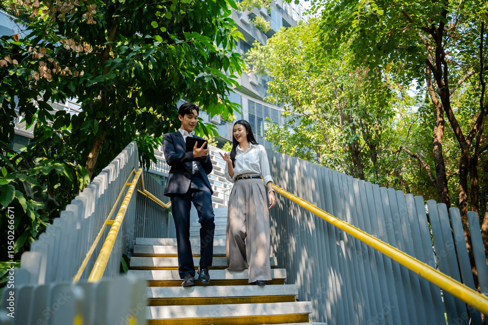 Business colleagues businessman and woman sitting and discussing,planning work using tablet outside office.City meeting and laptop with business people outdoor urban and green area for collaboration