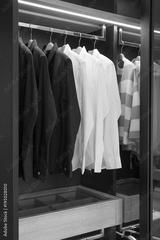 Black and white cloths hanging in wooden wardrobe at home