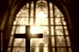 Silhouette of wooden cross inside antique church