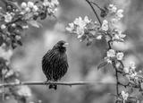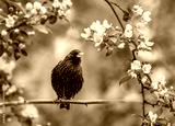 starling bird sings among the branches of a blossoming apple tree in a spring garden