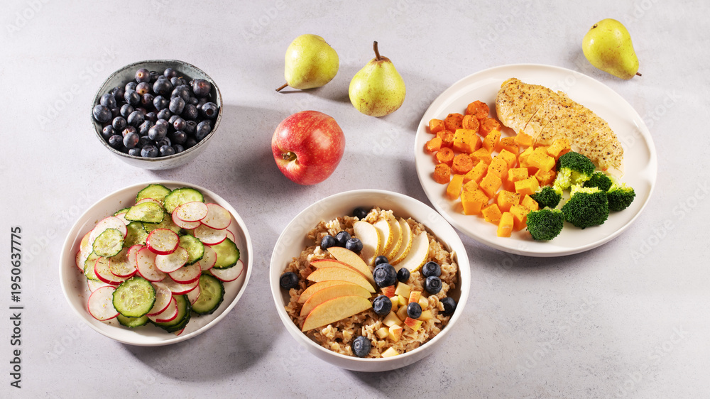 Balanced low histamine meal set with chicken, sweet potato, broccoli, cucumber radish salad and oatmeal with fruit and blueberries, heart healthy, diabetes and blood pressure friendly diet concept.