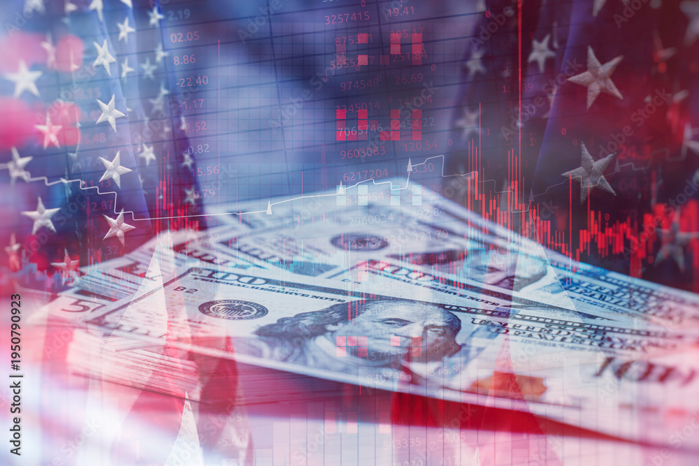 Stack of one hundred dollar bills layered with the US flag and a red declining stock market candlestick chart. Concept American economic crisis, inflation, recession risks and financial volatility.