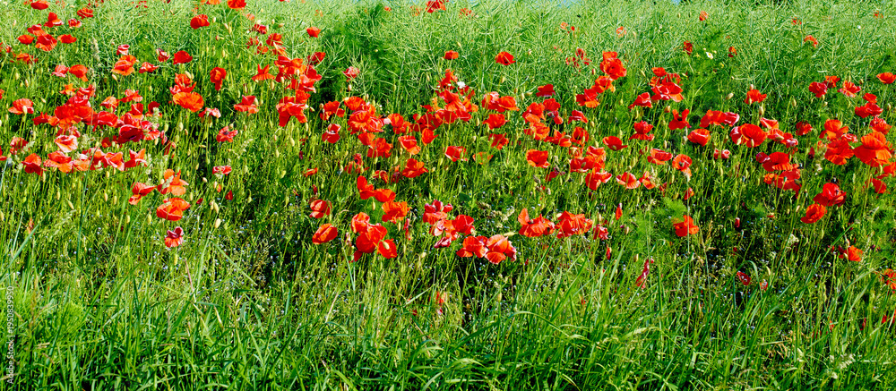Nature, poppy and flowers in bush for ecology, blossom and botany in countryside. Aesthetic, background and banner with field, floral plant and environment or ecosystem conservation in Denmark