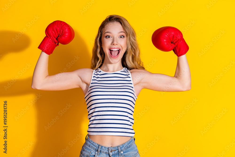 Cheerful woman in red boxing gloves celebrating success against a bright yellow studio background