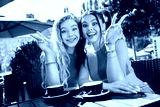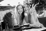 Two stylish young friends pose at sunny outdoor cafe enjoying a fun day in the city