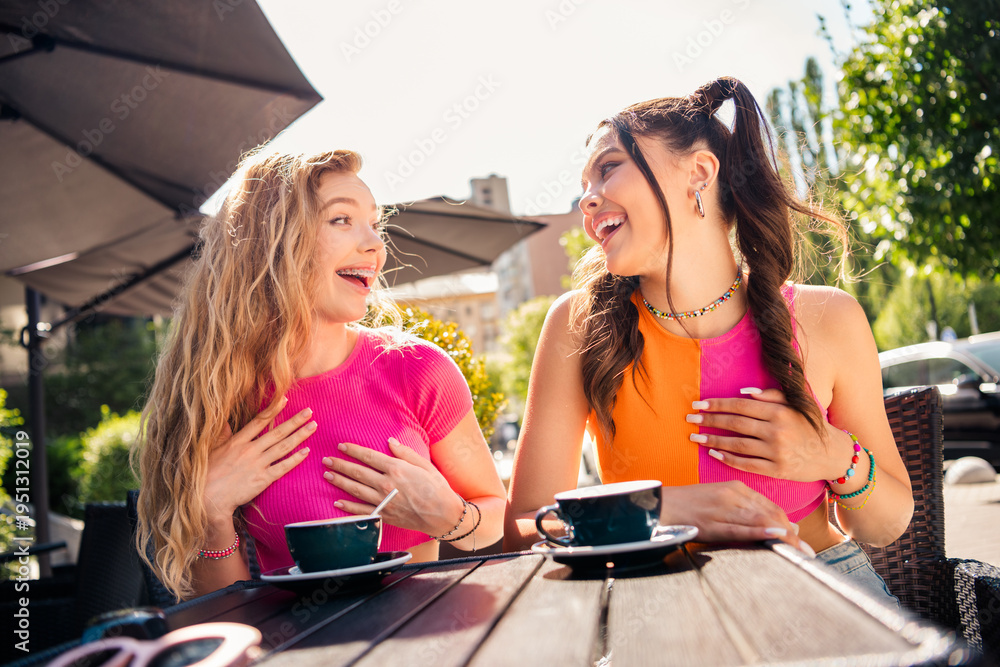 Two girlfriends share a joyful moment at an outdoor cafe smiling and laughing together in bright pink and orange outfits enjoying coffee and friendship on a sunny urban day today