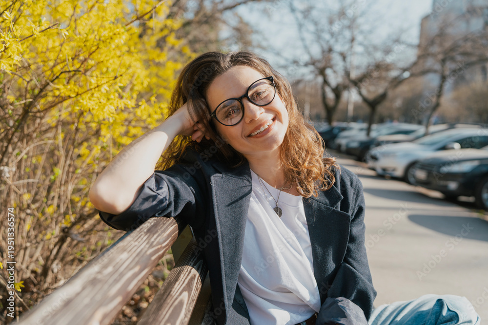 Relaxed young curly woman in glasses enjoying spring sun on a city bench under blooming yellow forsythia bushes