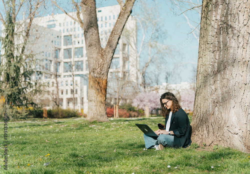 Young woman working on laptop in a blooming spring city park. Freelancer or student using computer outdoors
