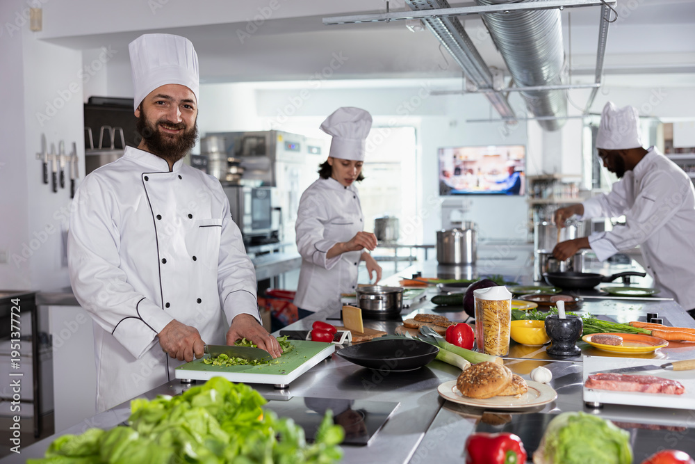 In a professional kitchen, male cook preparing gourmet meals by using cutting boards and chopping ingredients. Chef cooking with fresh produce, doing food prep for tasty dishes, gastronomy.