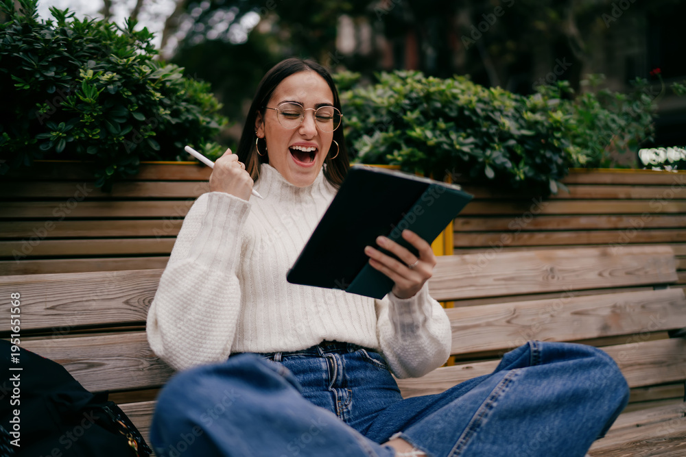 Overjoyed female designer rejoicing success while working on digital tablet outdoors, young woman in glasses and white sweater expressing triumph and happiness, startup victory and achievement.