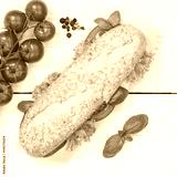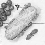 Sandwich Baguette Vollkorn Brötchen belegt mit Käse von oben Quadrat auf Holzbrett