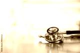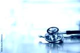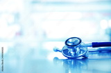 metal stethoscope for doctor diagnosis in blue science laboratory background