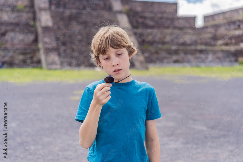 Boy tourist holding and observing a piece of obsidian in front of Teotihuacan pyramids, Mexico, symbolizing cultural discovery, archaeology, and educational travel