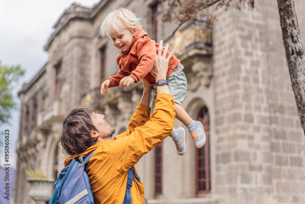 Father playfully tossing his young son in the air in front of Chapultepec Castle in Mexico City. Family travel, cultural heritage, joy, and bonding moment