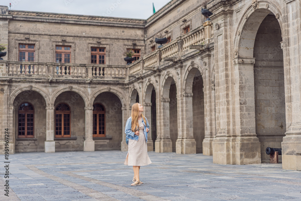 Young woman tourist standing near Chapultepec Castle in Mexico City, exploring the historic landmark. Solo travel, cultural heritage, tourism, and adventure concept