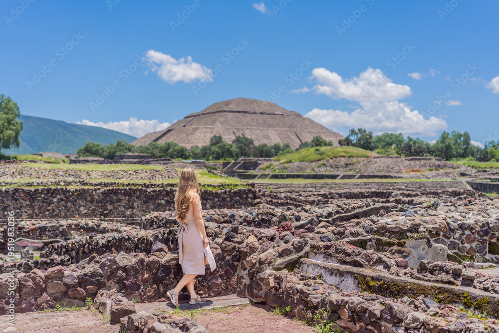 Female tourist standing in front of Teotihuacan pyramids in Mexico, enjoying sightseeing, adventure, and cultural heritage. Travel, tourism, and exploration concept