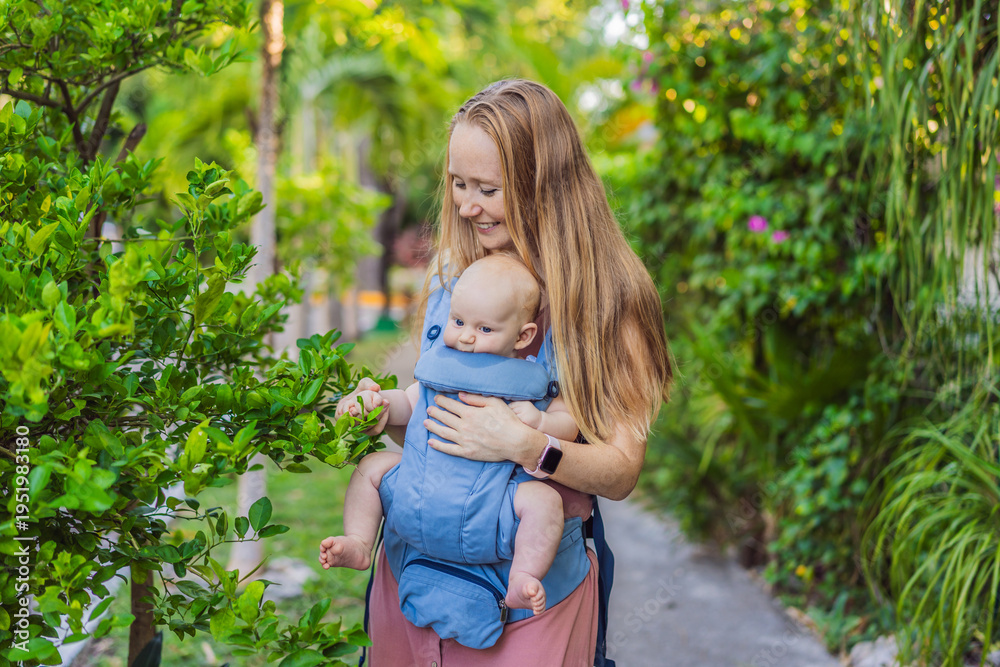 Mother using ergonomic baby carrier during a walk with her infant outdoors. Comfortable babywearing, active motherhood lifestyle, bonding, modern parenting, hands free care and everyday family routine