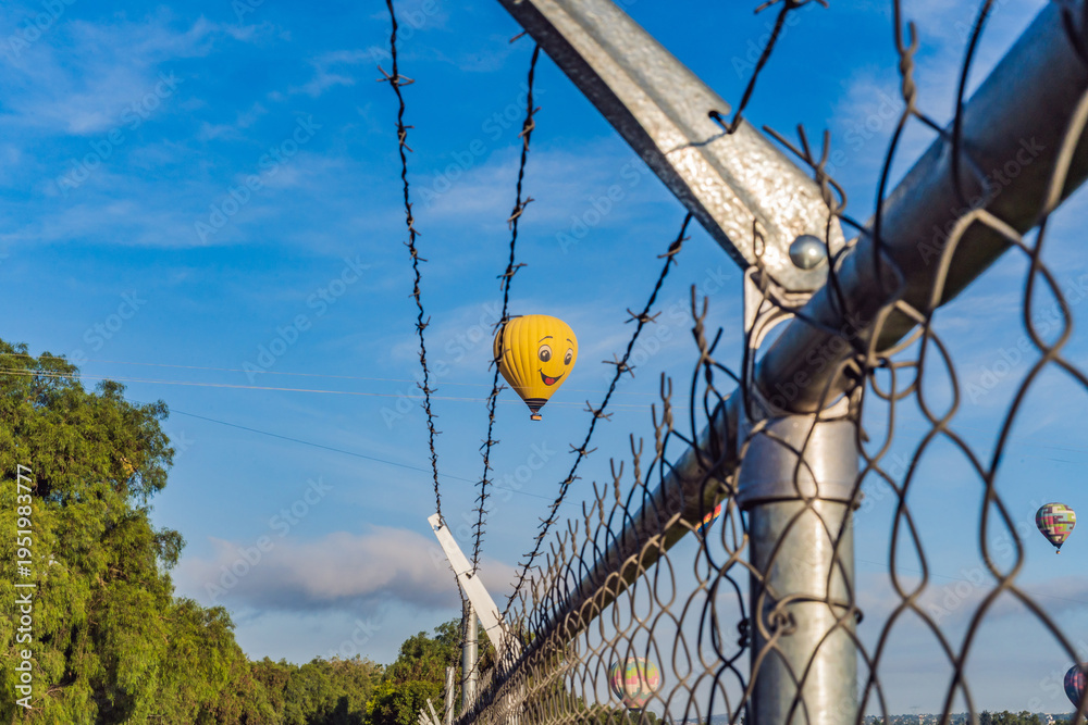 Hot air balloon with a painted smile floats in a clear blue sky, viewed through barbed wire, creating a playful yet thought-provoking travel and freedom concept