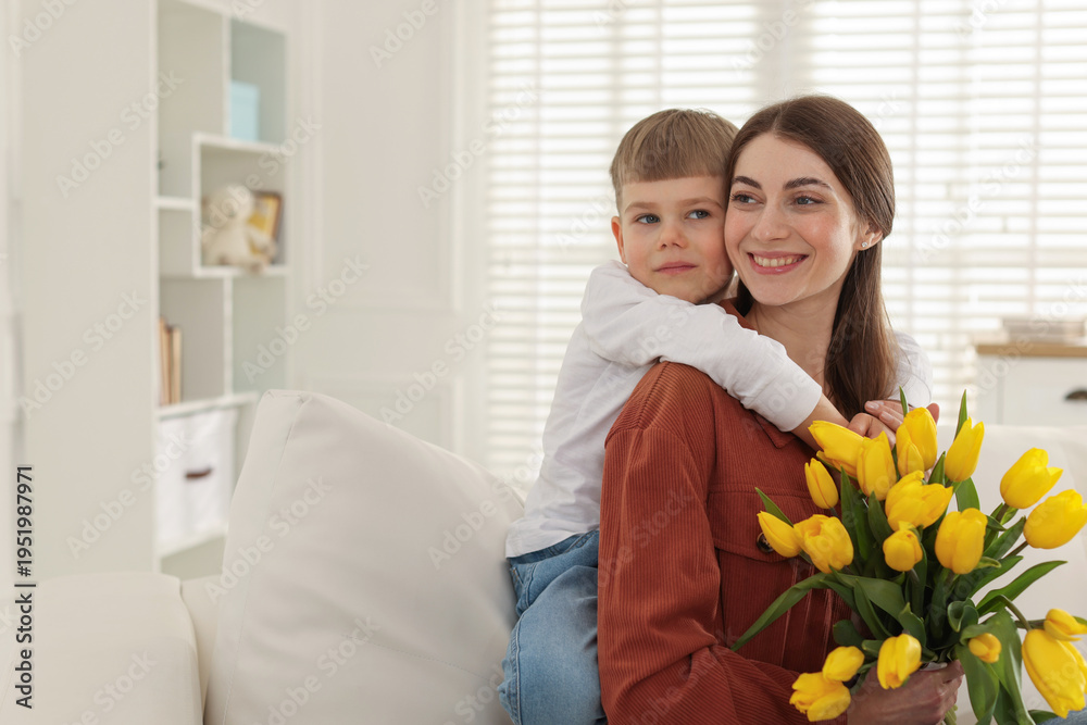 Mother's Day. Woman with her son and bouquet of tulips at home, space for text