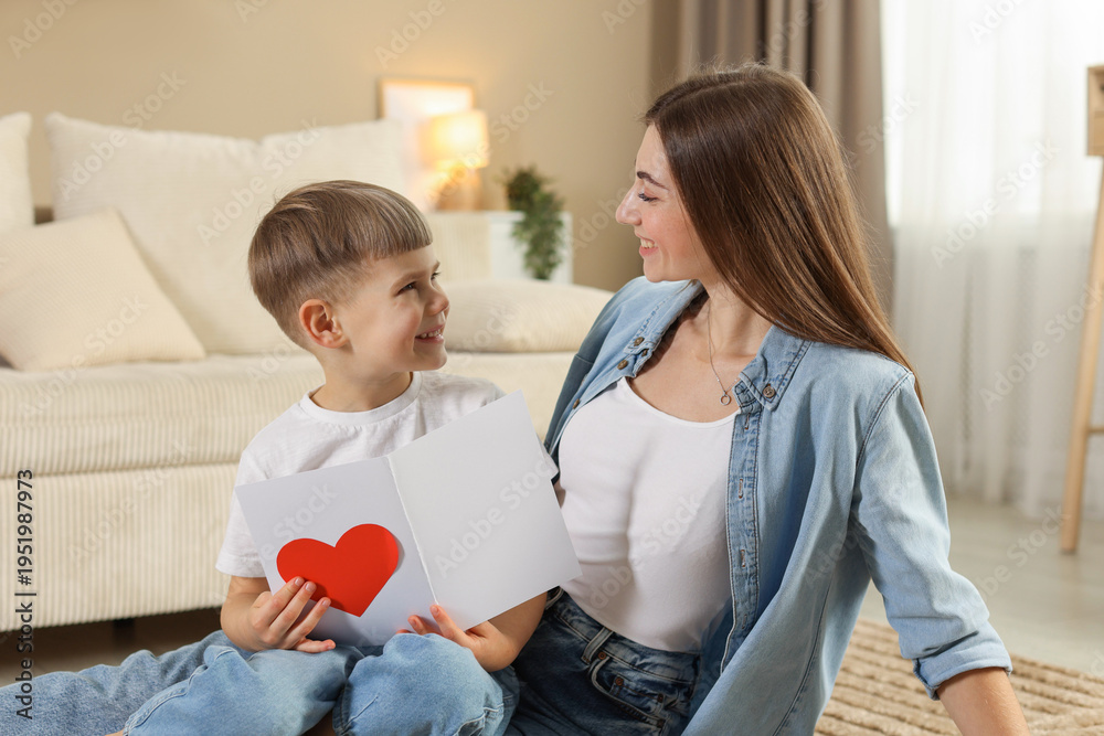 Mother's Day. Happy woman with her son and handmade greeting card at home