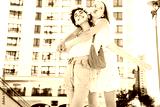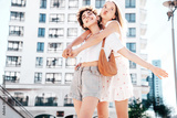 Two young beautiful smiling cute women in trendy summer sundress. Sexy carefree models posing in the street in sunny day. Positive models having fun and hugging. Cheerful and happy