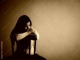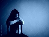 Depressed broken hearted woman sitting alone on a wooden chair in dark room at home. Lonly , sad, LOVE and valentines day concept.