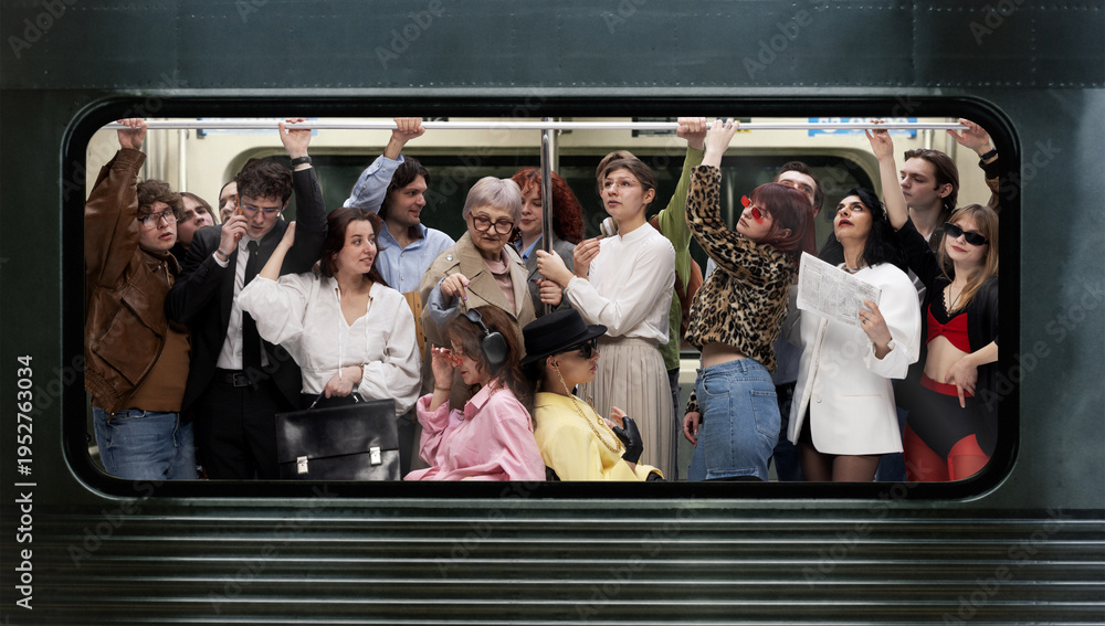Diverse group of passengers standing crowded inside subway train holding overhead rail in urban environment. Concept of daily commute, public transport, city lifestyle and rush hour crowd.