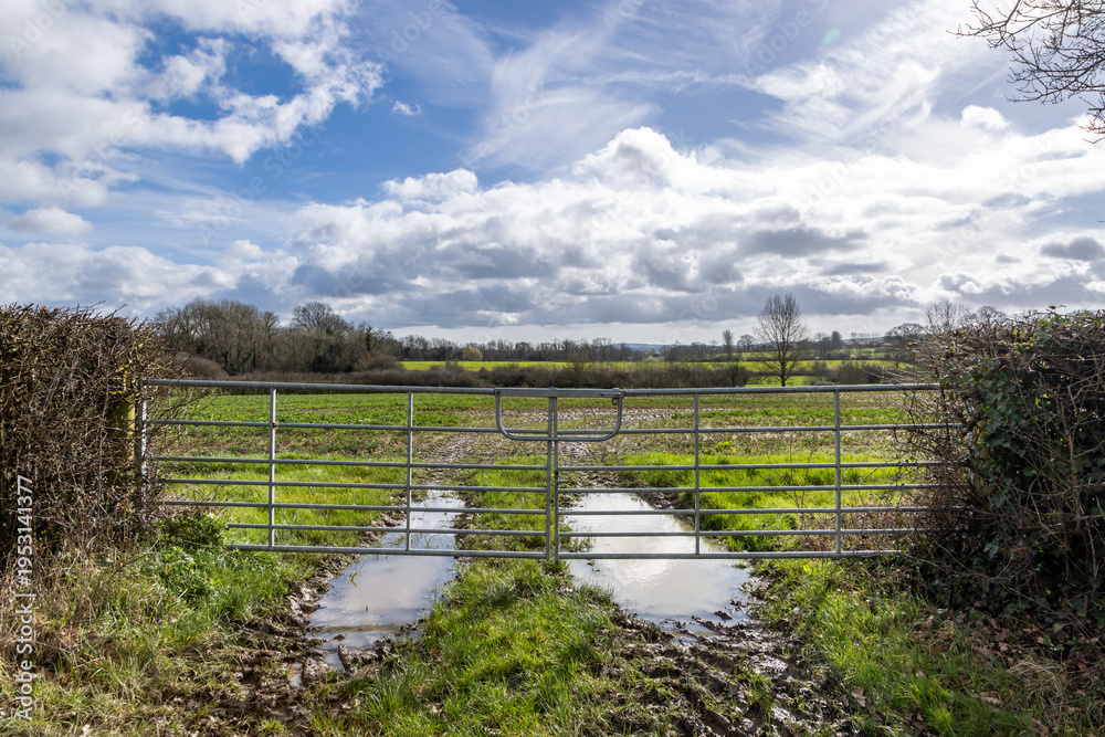 Looking out over a waterlogged field with a closed gate at the entrance
