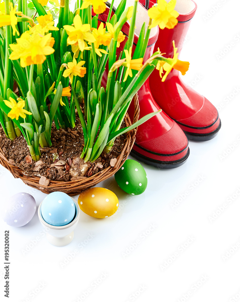 Easter still life with eggs and spring blossom yellow narcissus.