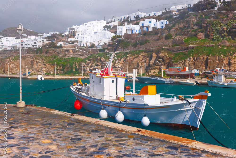 Pier with fishing boats in harbour of Mykonos City, Chora, on the island Mykonos in cloudy day, Greece