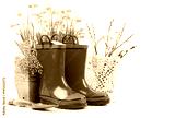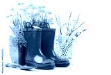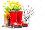 Spring gardening flower narcissus still life with red boots