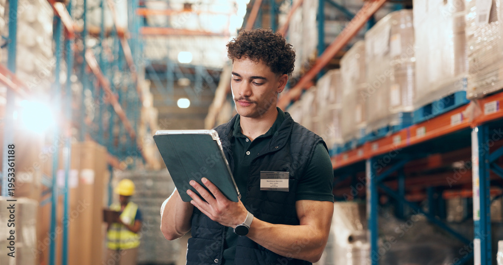 Man, logistics and checking inventory with tablet in warehouse for stock control. Person, employee or checklist with technology for shipping storage, freight maintenance or security in depot