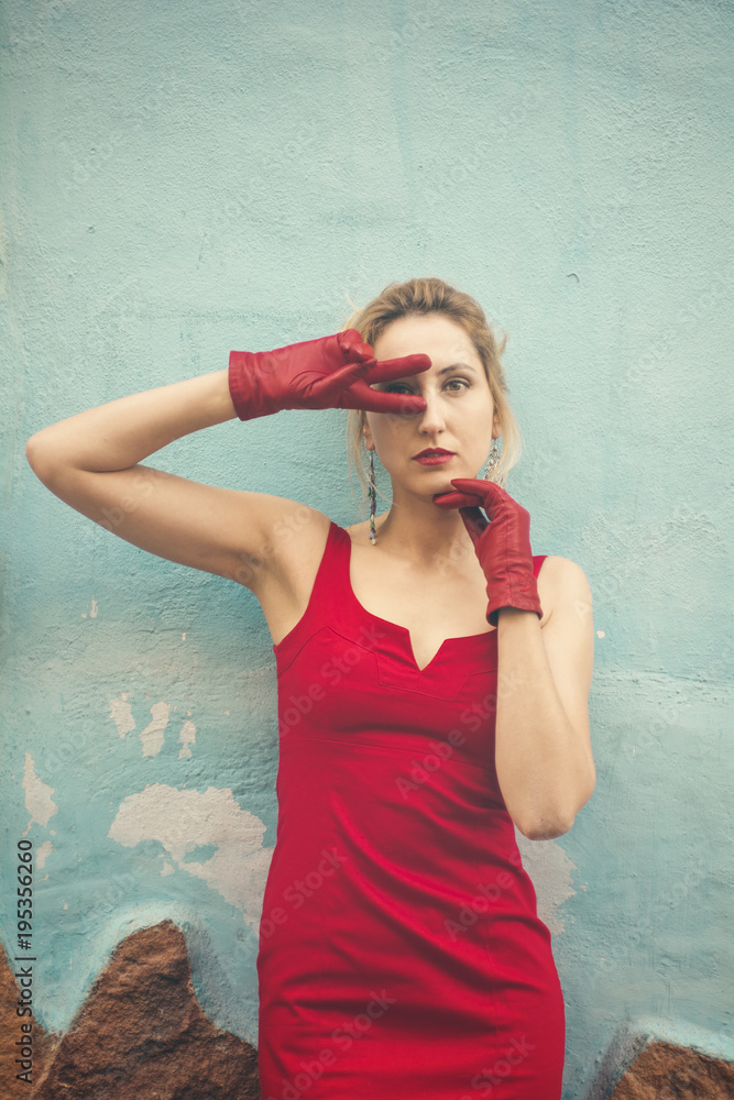 Portrait of a beautiful woman with red dress and gloves over a turquoise wall, urban street style mood, she has a funny attitude