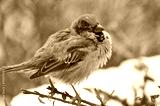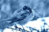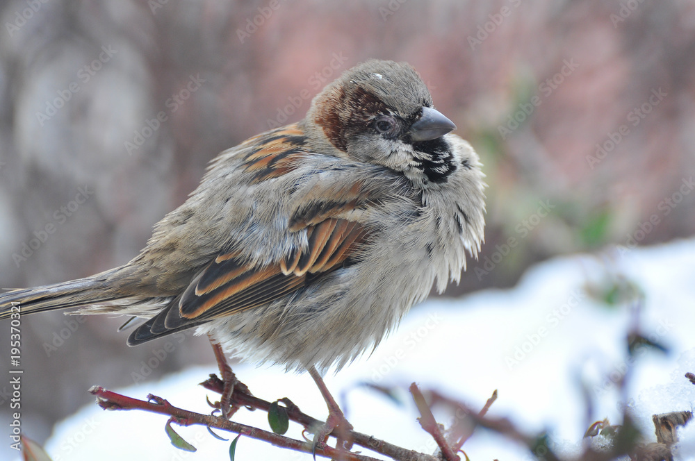 Sparrow freezing in city park in winter. Birds try to get warm while snowing.