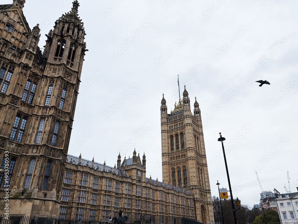 Palace of Westminster and Victoria Tower historic Gothic architecture in London, UK under overcast sky
