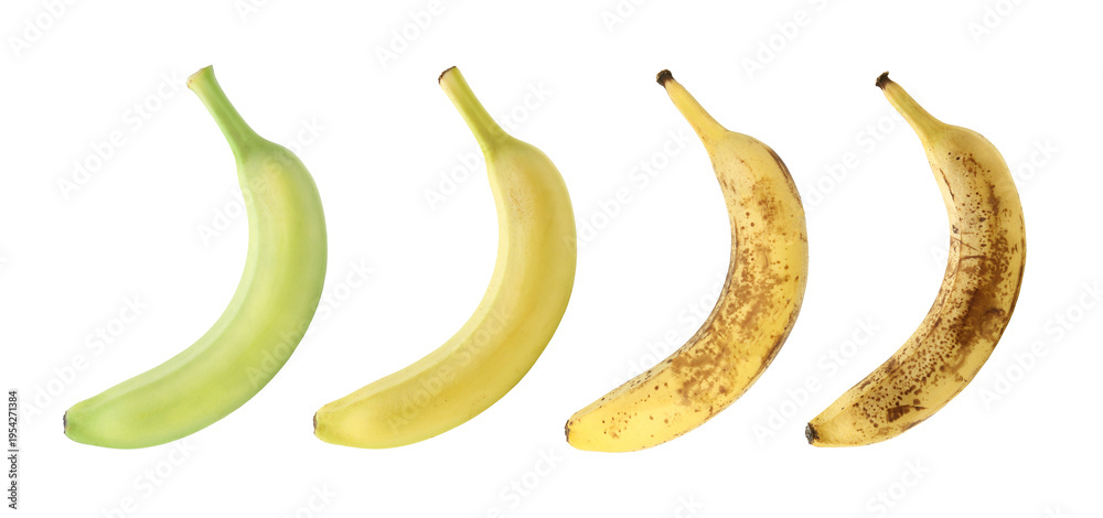 Ripening stages of banana fruits on white background, set