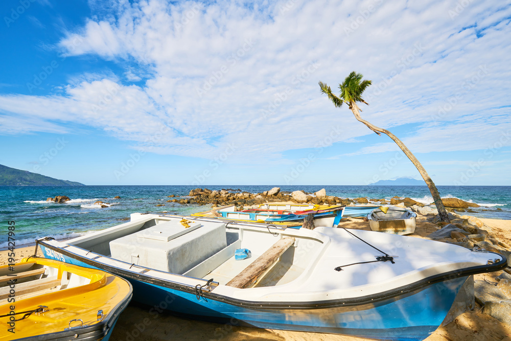 Small fishing canoes on the sand of Mahe, seychelles Island