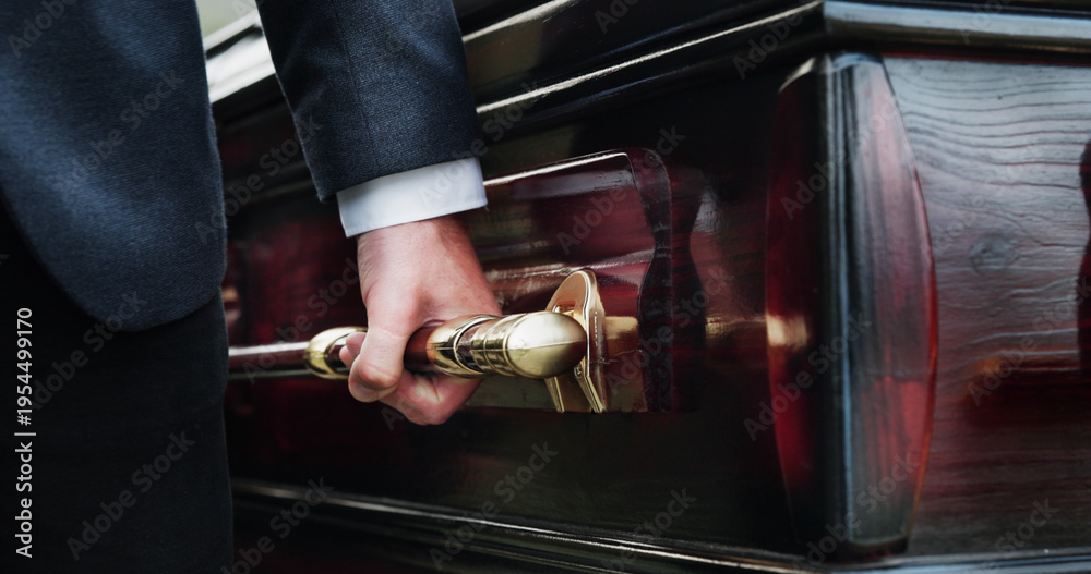 Hands, handle and man with coffin for funeral, sad and compassion for death ceremony. Closeup, person and bereavement with casket, memorial service or support for loss, religion or respect with grief