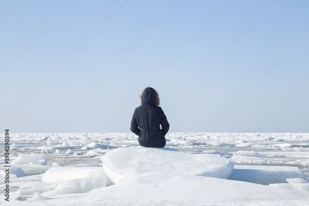 Young adult woman sitting alone on white ice floe and looking far away at frozen sea in cold winter day. Enjoying nature. Back view.