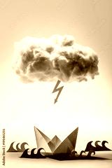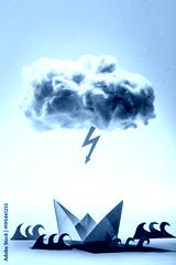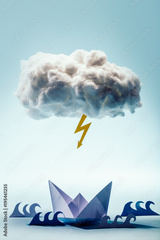 Paper boat and waves beneath a cloud and bolt.