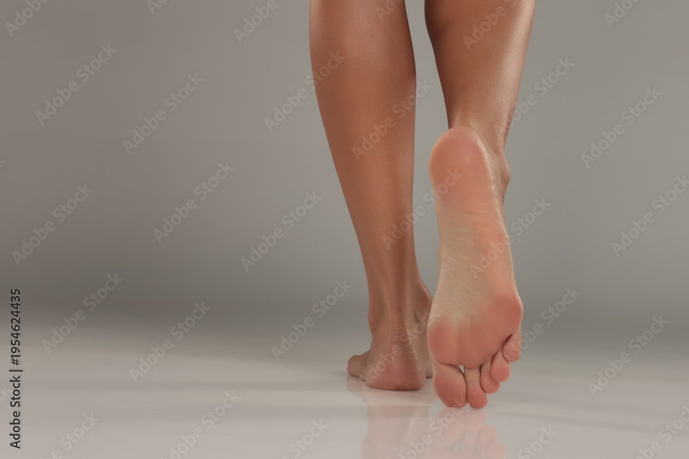 Studio shot of a woman’s tanned legs and bare feet from behind, posing and showing foot sole on a grey background