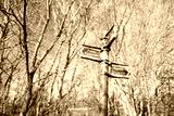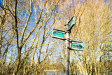 Multiple Public Footpath sign seen in a forest clearing at a nature reserve in the east of England. In the distance is a large lake, home to many breeding birds.