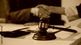 Judge gavel on desk with handshake in background, symbolizing legal agreement, settlement, or contract signing in office setting.