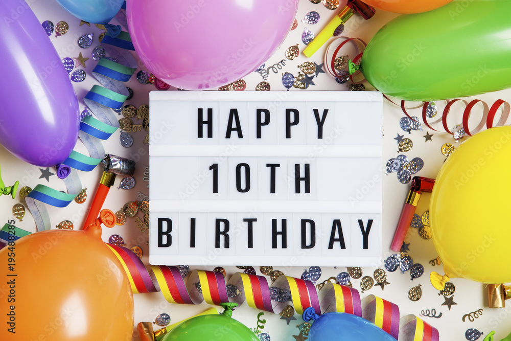 Happy 10th birthday celebration message on a lightbox with balloons and confetti