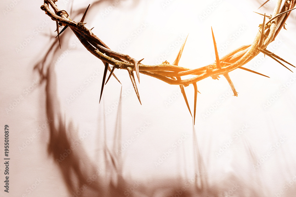 Crown of thorns casting a distinct shadow a white background, creating a symbolic easter image of suffering, sacrifice, and remembrance Copy good space text for friday