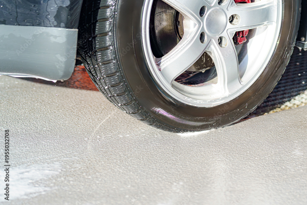 The car tire spins on the slippery surface as water and soap blend together during a thorough washing session at the car wash