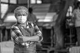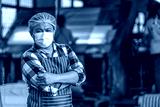 Confident textile factory worker posing with arms crossed in weaving machine mill. Portrait of male industrial staff wearing face mask and ear protection standing in fabric manufacturing plant.