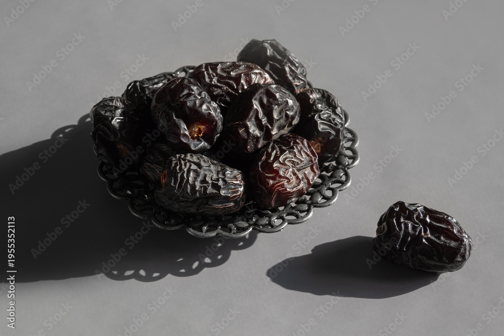 Dark dried dates in ornate bowl, single one beside