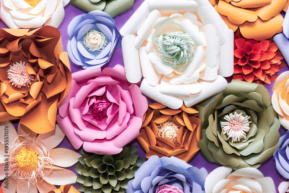 Colorful paper flowers on wall. Handmade artificial floral decoration. Spring abstract beautiful background and texture