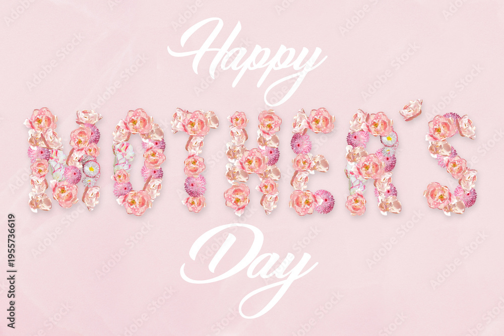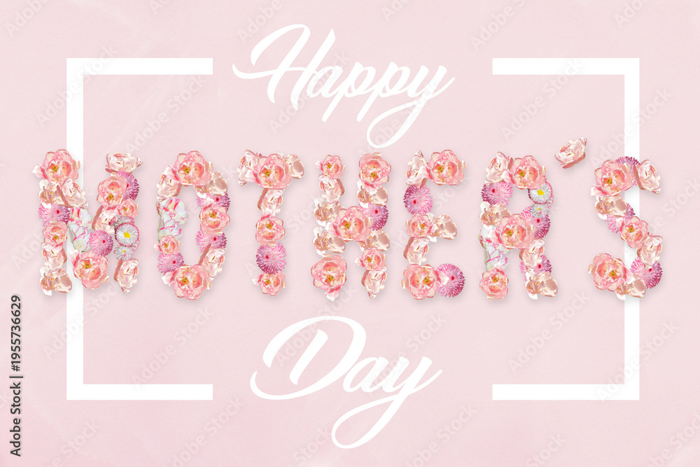 Happy Mothers Day greeting card with white frame and floral letters over a soft pink stone background
